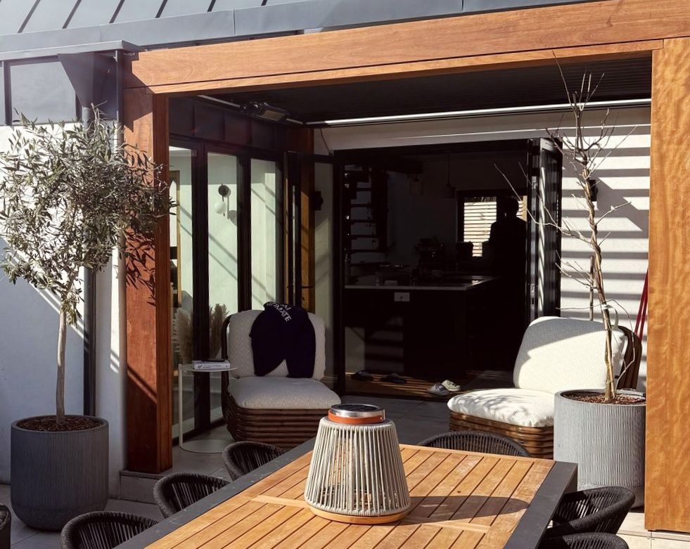 The covered seating area was crafted for year-round use, featuring built-in heating and lighting, yet fully clad in natural teak to maintain warmth and authenticity. A bespoke Japanese-inspired trellis was designed to support a newly planted wisteria, creating a soft, relaxing ambiance alongside olive trees, while Gubi chairs add the perfect bohemian touch.
